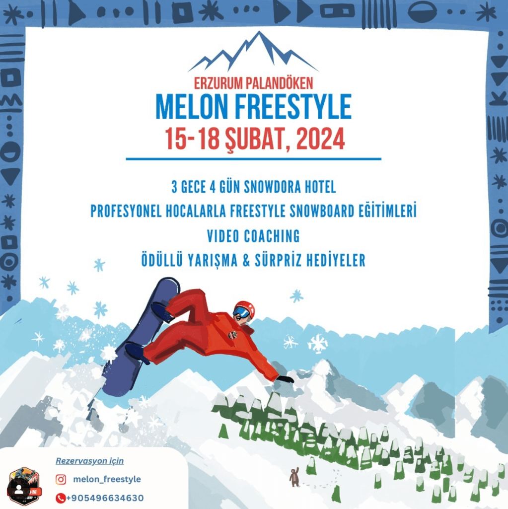 Sezonunun ikinci Melon Freestyle Camp’ı, 15-18 Şubat tarihinde Palandöken Kayak Merkezinde gerçekleşecek. 3 gece 4 gün sürecek kampın konaklaması Snowdora Hotel’de yapılacak .
