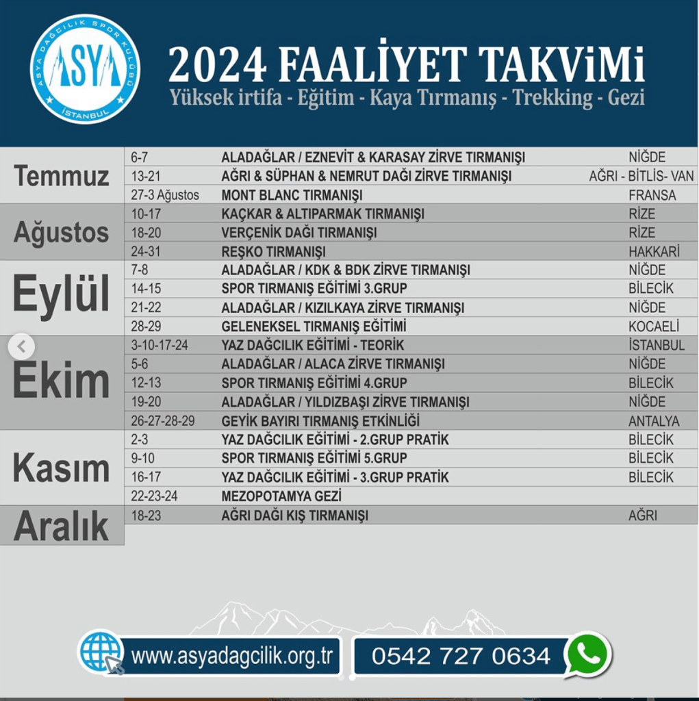2024 dağcılık, tırmanış ve hiking programlarını yayınlayan Asya Dağcılık Spor Klübü; Süphan, Erciyes, Kızlar Sivrisi, Uludağ, Nemrut, Ağrı, Monte Blanc, Kaçkar, Altıparmak, Verçenik, Reşko olmak üzere yurt içi ve yurt dışı programları ile yüksek irtifa etkinliklerini sürdürüyor.