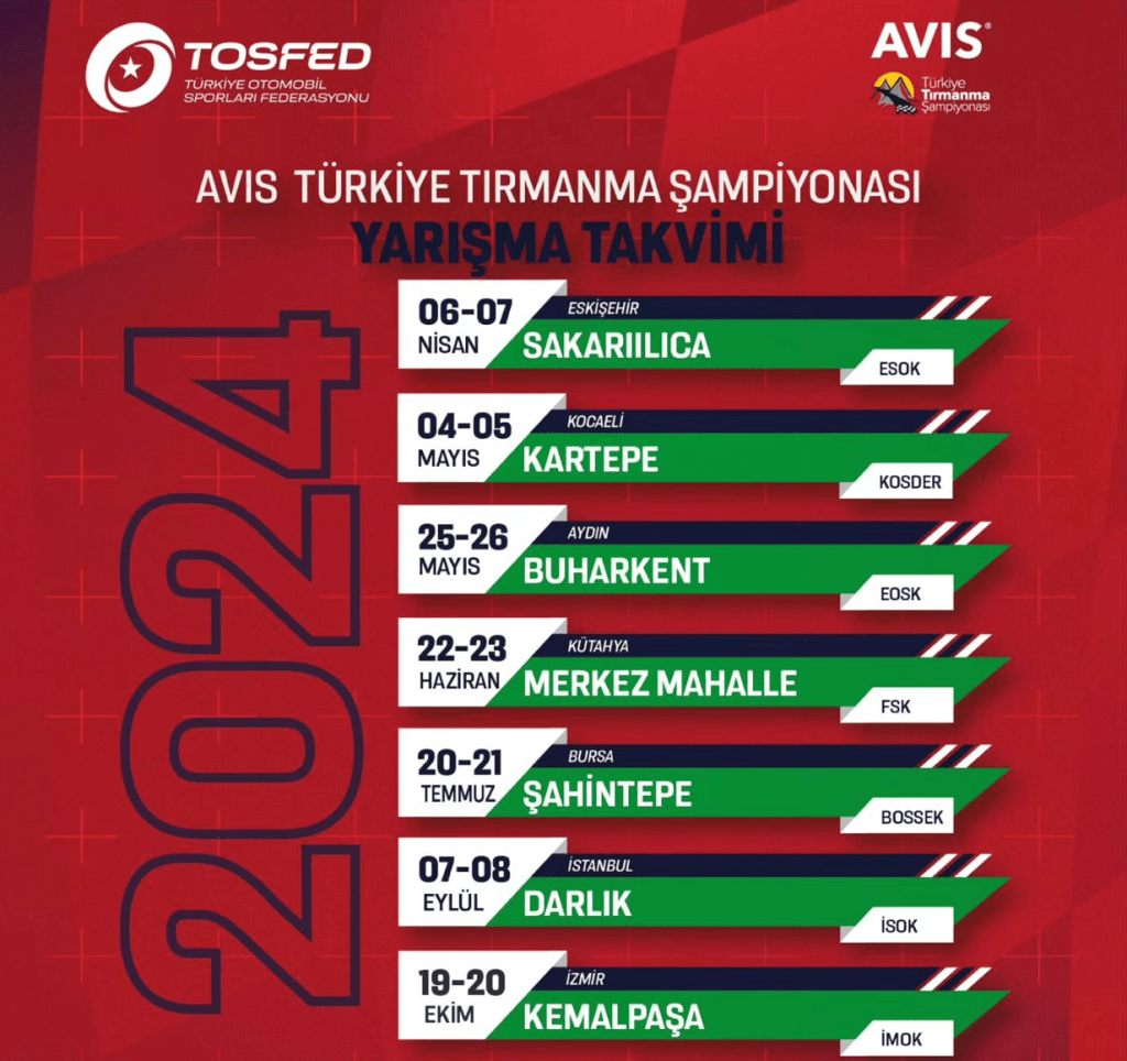 Tosfed tarafından; 2024 Oyman Atabay sezonu, AVIS Türkiye Tırmanma Şampiyonası takvimi açıklandı. Nisan ve Ekim ayları arasında 7 ayrı kulüp tarafından düzenlenecek olan yarışma, Eskişehir, Kocaeli, Kütahya, Aydın, Bursa, İstanbul ve İzmir’de gerçekleşecek.