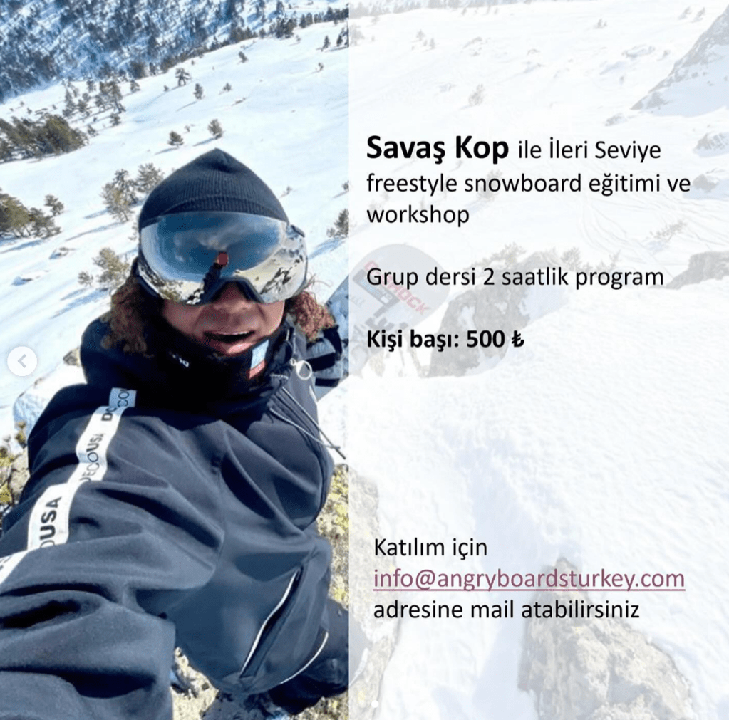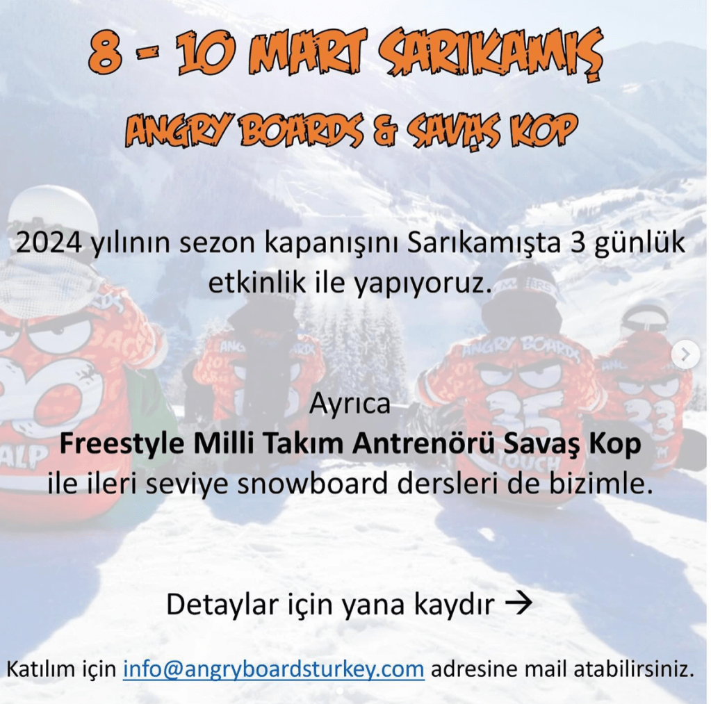 Angryboards ekibi sezon kapanışında Freestyle Milli Takım Antrenörü Savaş Kop ile ileri seviye snowboard eğitimi ve workshopunu, 8-10 Mart tarihleri arasında, Sarıkamış Habitat Hotel’de gerçekleştirecek.