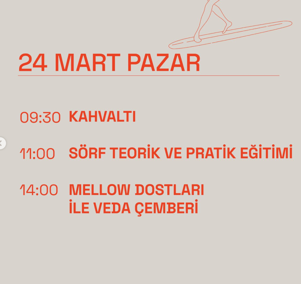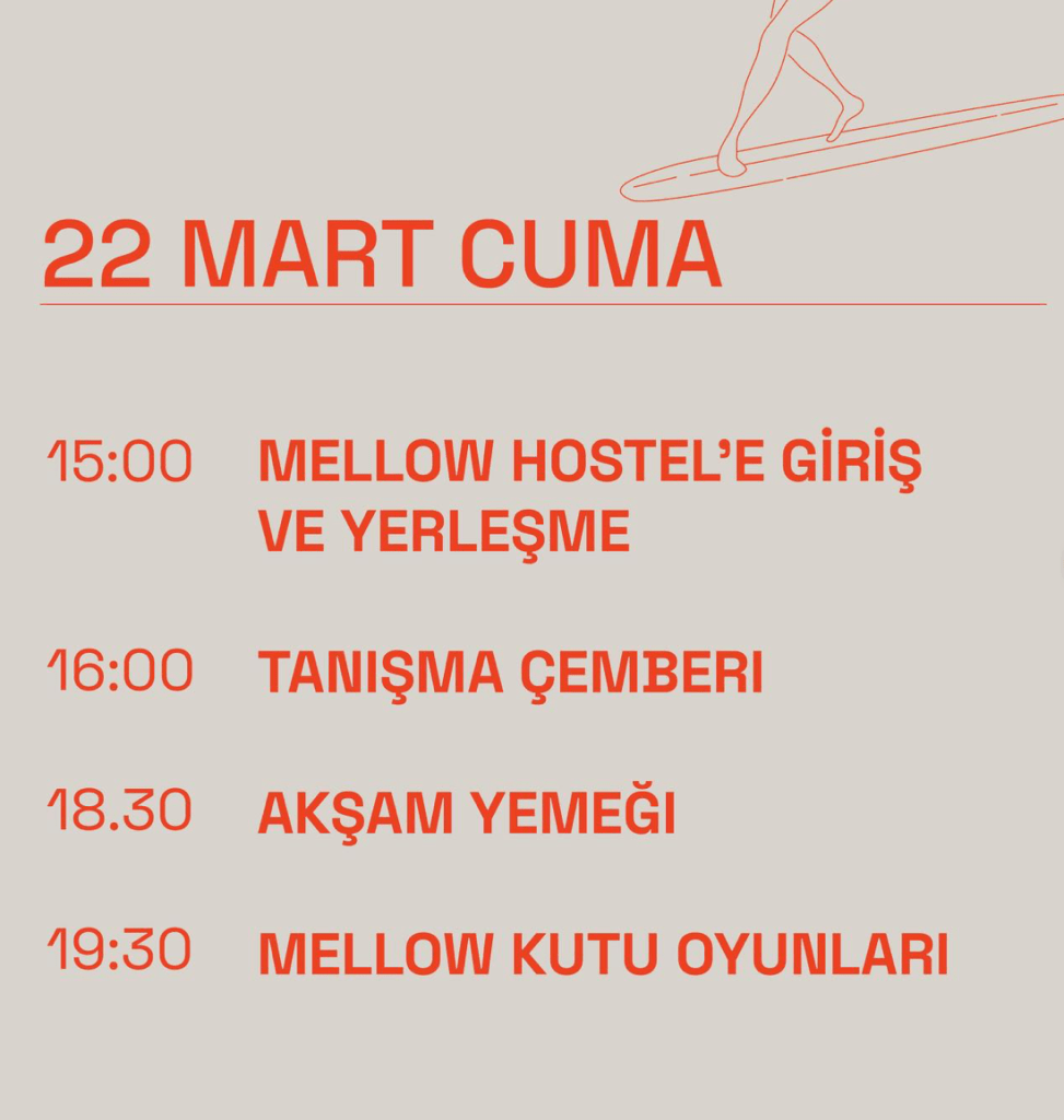 Sörf, yoga, yürüyüş, çeşitli oyunlar dahil olan 3 günlük programa katılım ve detaylı bilgi için; https://www.mellowturkey.com