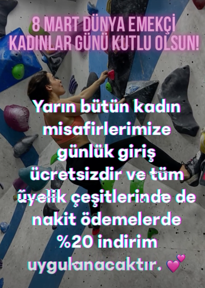 Climbinn İzmir Boulder Tırmanış Salonu, 8 Mart Dünya Kadınlar Günü’ne özel ücretsiz günlük giriş ve tüm üyelik çeşitlerinde nakit ödemelere %20 indirim uygulamakta.