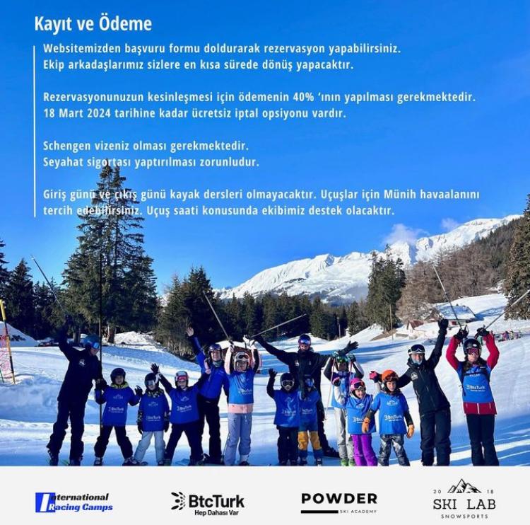 Kartalkaya Kayak Merkezi’nde Kartal Otel bünyesinde bulunan Powder Academy ve Kayaplazza Otel bünyesinde bulunan BtcTurk Kayak Okulu ile SkiLab ekibi, 8-15 Nisan 2024 tarihlerinde Avusturya Kaprun’a Kayak Kampı düzenlemekteler.
