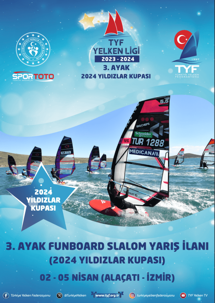 Türkiye Yelken Federasyonu, Yelken Ligi 3. Ayak Yarışları ( 2024 Yıldızlar Kupası ) Funboard Slalom sınıflarında 02 – 05 Nisan 2024 tarihleri arasında Alaçatı’da yapılacaktır.