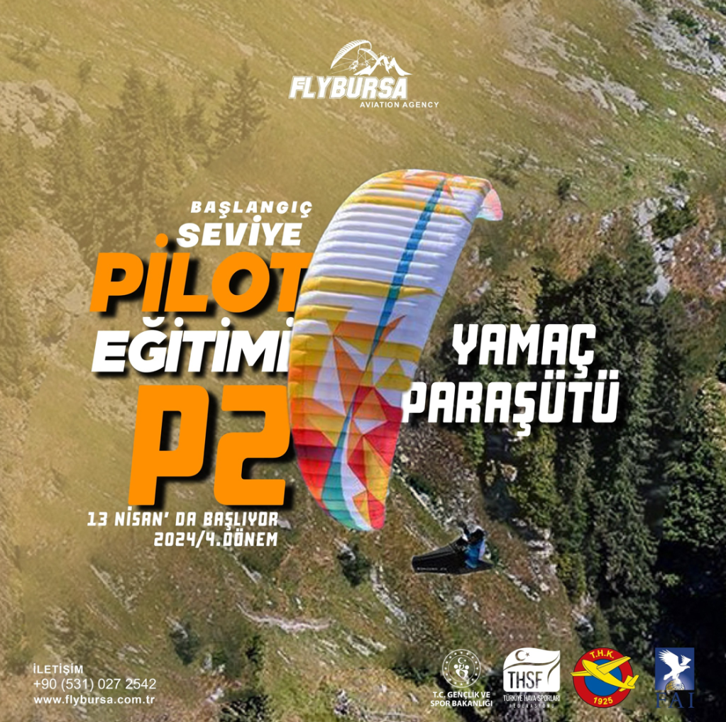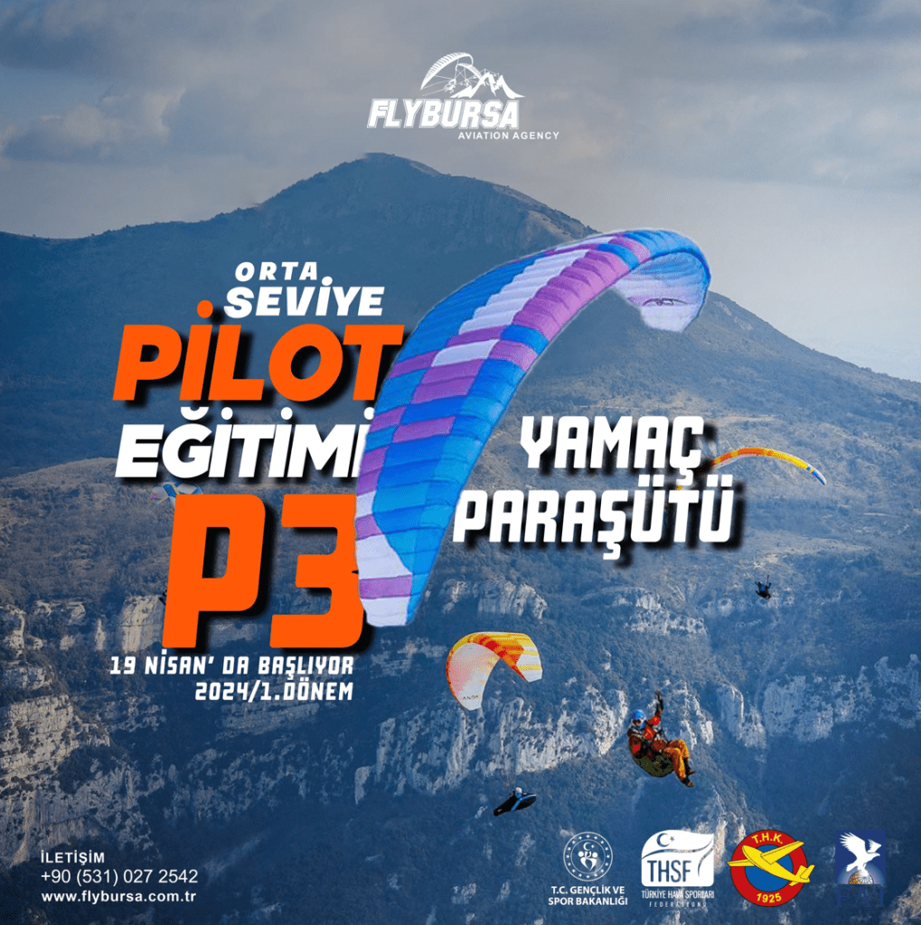 FlyBursa ekibi tarafından düzenlenen 4. Dönem Yamaç Paraşütü başlangıç seviye pilot eğitimi 13 Nisan’da, 1. Dönem P3 Yamaç Paraşütü orta seviye pilot eğitimi 19 Nisan’da başlıyor.