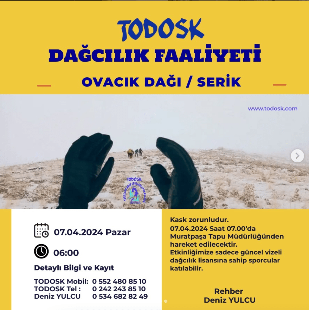 TODOSK (Toroslar Doğa Sporları Spor Kulübü) tarafından 7 Nisan tarihinde Antalya, Ovacık Dağı/ Serik’de dağcılık zirve tırmanışı faaliyeti gerçekleştirilecek.
