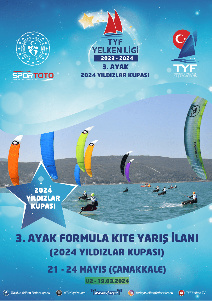 Türkiye Yelken Federasyonu’nun 2024 yılı Faaliyet Programı’nda yer alan TYF YELKEN LİGİ 3. Ayak Yarışları ( 2024 Yıldızlar Kupası ) Formula Kite sınıflarında 21 – 24 Mayıs 2024 tarihleri arasında Çanakkale’de yapılacaktır.