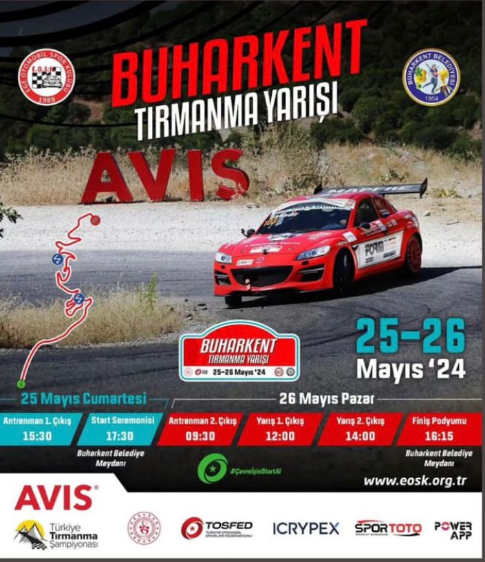 Icrypex ana sponsorluğunda, Türkiye Otomobil Sporları Federasyonu (TOSFED) AVIS 2024 Türkiye Tırmanma Şampiyonası’nın 3. yarışı Ege Otomobil Sporları Kulübü (EOSK) tarafından Buharkent Belediyesi destekleri ile 25-26 Mayıs tarihlerinde Aydın – Buharkent’te düzenleniyor.