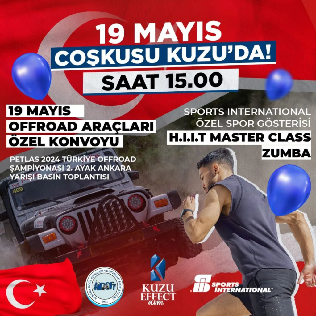 19 Mayıs Atatürkü Anma, Gençlik ve Spor Bayramı kapsamında Kuzu Effect AVM’de özel araçların sergisi ile birlikte offroad konvoyu, saat 15.00’da etkinlik ve PETLAS 2024 Türkiye Offroad Şampiyonası 2.Ayak Ankara yarışının basın toplantısı gerçekleştirilecek.
