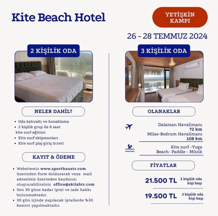 Üç gün sürecek olan kampa oda kahvaltısı, 2 kişilik grup ile 6 saatlik kitesurf eğitimi, kitesurf ekipman kiralaması, plaj giriş ücreti dahil.