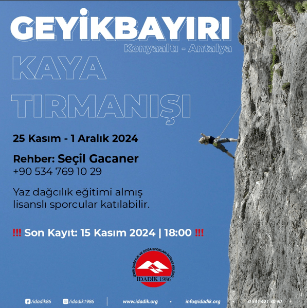 İzmir Dağcılık ve Doğa Sporları İhtisas Spor Kulübü (İDADİK) tarafından Antalya’da Geyikbayırı Kaya Tırmanış Etkinliği 25 Kasım – 1 Aralık tarihleri arasında gerçekleştirilecektir.