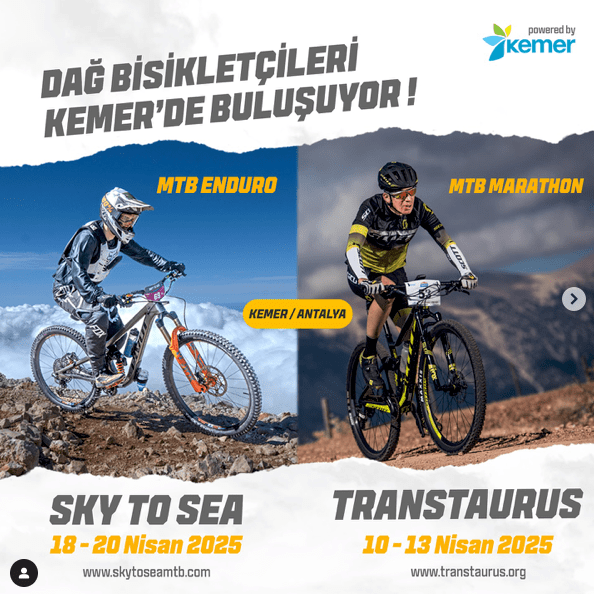 Türkiye’nin en ekstrem Enduro Dağ Bisikleti Etkinliği III. SKY TO SEA MTB ENDURO @skytosea_mtb 18-20 Nisan 2025 Olimpos (Tahtalı) Dağının 2.365 m zirvesinden kar üzerinden start alacak ve bu yıl yurt dışından Enduro branşının önemli isimlerini ağırlayacak.