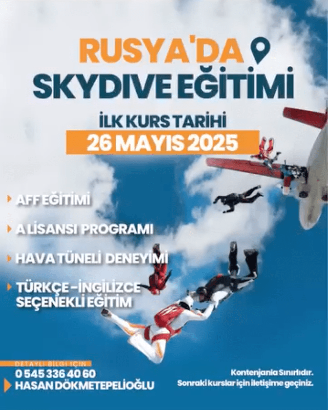 Hasan Dökmetepelioğlu tarafından Rusya’da 26 Mayıs 2025 tarihinde başlayan Skydive eğitimi düzenlenmekte.
