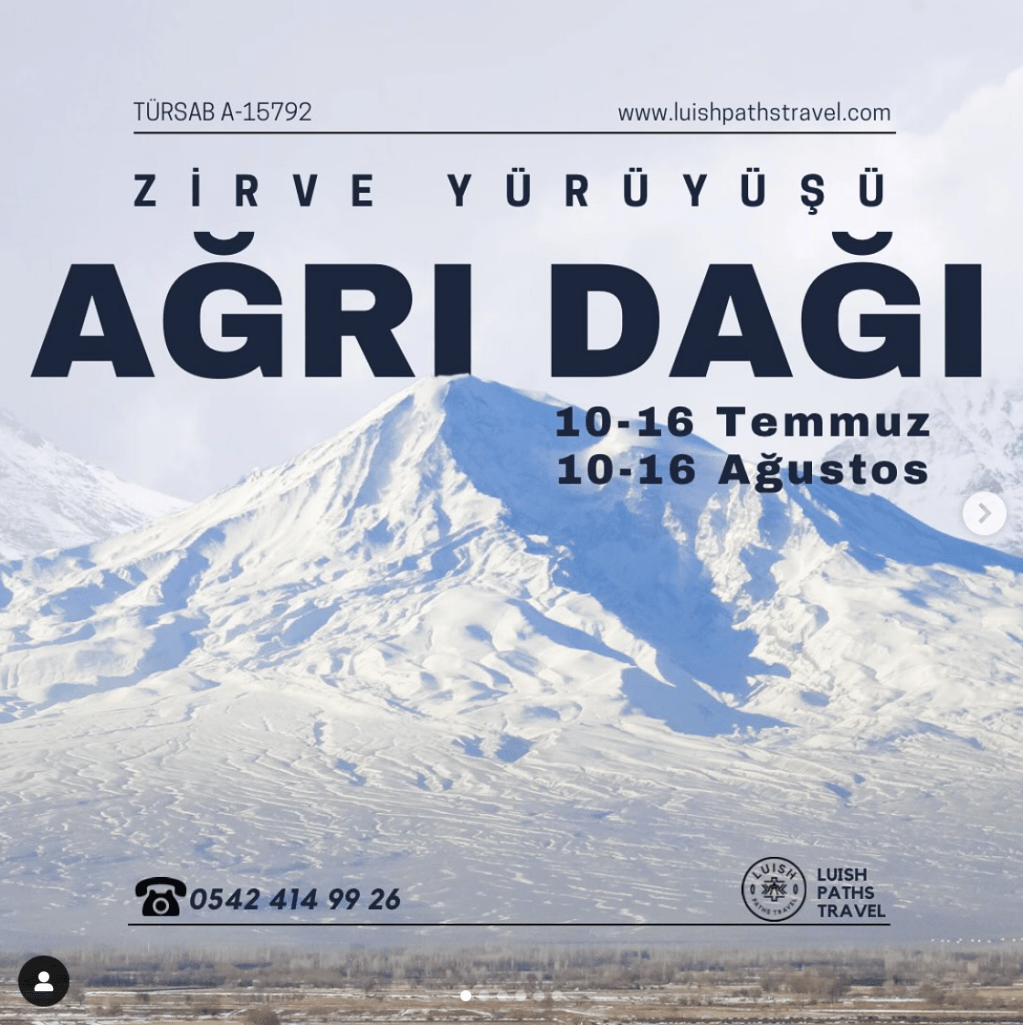 Luish Paths Travel ile Ağrı Dağı Zirvesine 10-16 Temmuz ve 10-16 Ağustos tarihlerinde yürüyüş düzenlenmekte. 🗓 Süre: 7 gün boyunca sürecek olan bu etkinlik, yürüyüşçülerimize doğayı derinlemesine deneyimleme fırsatı sunacak.🏕 Konaklama: Dağın eteklerinde kurulan kamp alanlarında geceleyin ve gökyüzündeki yıldızların altında dinlenin (2 gece hotel, 4 gece çadır).🌄 Zirve: Ağrı Dağı’nın zirvesine ulaşarak, unutulmaz bir…