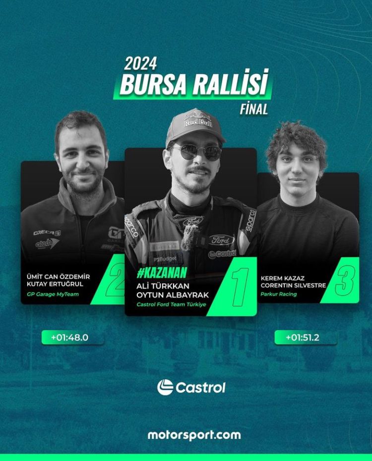 Bursa Rallisi’nde Ali Türkkan – Oytun Albayrak ikilisi Bursa’da 8/8 etap zaferiyle galibiyete ulaştı. Podyumu Ümit Can Özdemir ikinci sırada ve Kerem Kazaz üçüncü sırada tamamladı. Görsel: https://tr.motorsport.com