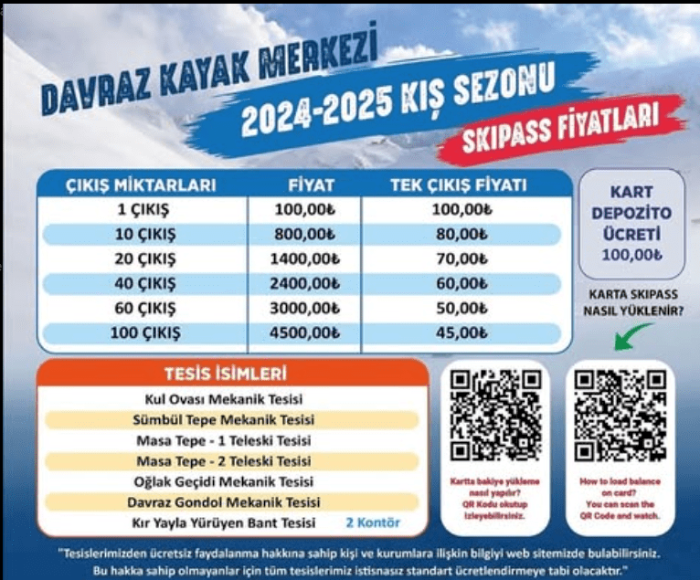 Isparta’da bulunan Davraz Kayak Merkezi 2024-2025 sezonu skipass fiyatları yayınlanmıştır.