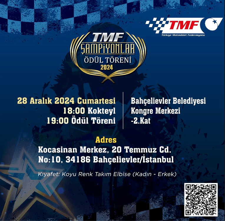Türkiye Motosiklet Federasyonu Ödül Töreni 28 Aralık’ta Bahçelievler Belediyesi Kongre Merkezi’nde gerçekleştirilecek.