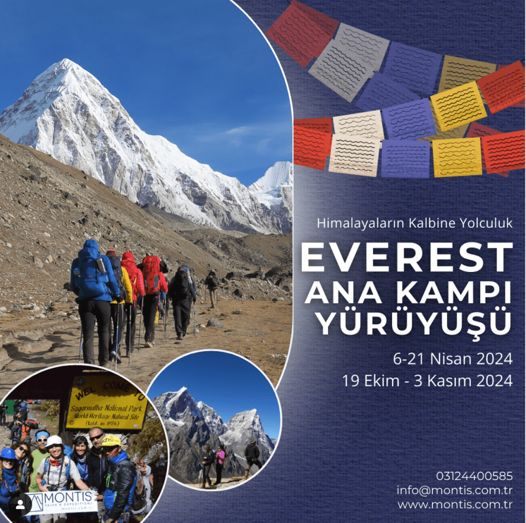 Montis Trips & Expeditions ile Everest Dağı Ana Kamp Yürüyüşü 6-21 Nisan tarihlerinde gerçekleşecek. Kasım ayında ikincisi gerçekleşecek olan yürüyüş turuna dahil olanlar; Katmandu rehberlik, yürüyüş boyunca basit pansiyonlarda konaklama, otel-havaalanı transferi, yürüyüş boyunca hayvan veya taşıyıcılarla eşyaların taşınması, seyahat sigortası, vergiler, lukla-katmandu-lukla iç hat uçuşları, milli parkı ücretleri, temel ilkyardım seti ve ilaçlar, şehir…