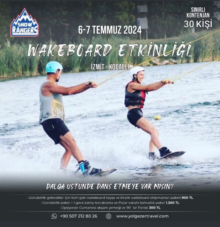 6-7 Temmuz tarihlerinde grup üyelerine indirimli fiyatları bulunan SnowRangers ekibi ile İzmit-Kocaelinde Wakeboard etkinliği düzenlenmekte. Etkinliğe katılacaklar ve Snowrangers ekibi ile iletişime geçecekler için watsapp grubu; https://chat.whatsapp.com/BBtIUYcs96k9Ak37k85RVj