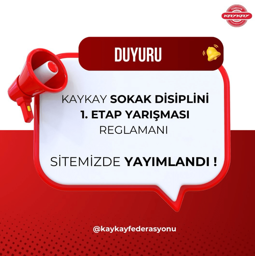 25-26 Mayıs 2024 tarihleri arasında Bursa Sukaypark Tesisleri Kaykay Parkında yapılacak olan Kaykay Sokak Disiplini 1. Etap yarışması‘nda 2024 yılında vizeli lisansı olan tüm kadın ve erkek sporcular resmi evrakların tamamlanmasının ardından katılabileceklerdir. Detaylı bilgi ve katılım için; https://kaykay.org.tr/turkiye-kaykay-federasyonu-baskanligi-kaykay-sokak-disiplini-1-etap-yarismasi-reglamani/