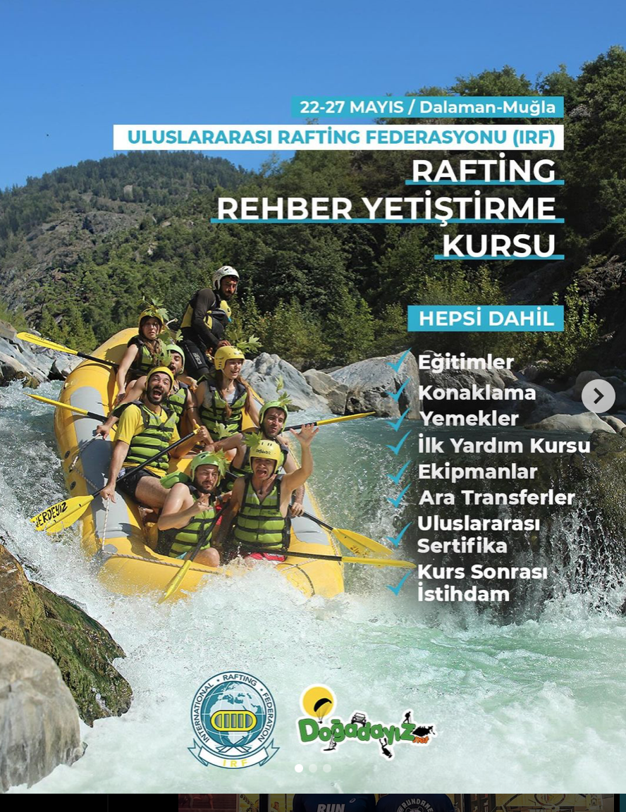 Rafting Rehber Yetiştirme Kursu 22-27 mayısta Dalaman/Muğla (5 Gece 6 Gün)gerçekleştirilecek. Kursa dahil olanlar; 5 gece 6 gün konaklama ( paylaşımlı oda ), sabah-akşam yemeği ( set menü), öğle yemeği ( nehirde kumanya), ilk yardım kursu, ekipmanlar, uluslararası rafting federasyonu eğitmen ve kurs ücretleri, kurs sonunda başarılı olanlar için dijital kart ve diplomalar, Fethiye – Gürleyik…