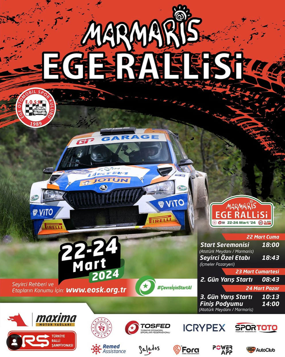 Türkiye Otomobil Sporları Federasyonu (TOSFED) Petrol Ofisi Maxima 2024 Türkiye Ralli Şampiyonası’nın 2. yarışı olan Ege Rallisi 22-24 Mart tarihlerinde Marmaris ve çevresinde gerçekleşecek. Seyirci etaları ve konumu için; www.eosk.org.tr