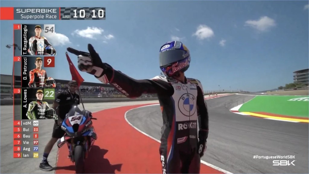 Toprak Razgatlioglu, Portekiz SBK yarışını galibiyetle tamamlayarak üst üste 12 yarış kazanmış oldu. Pistten iner inmez Yusuf Dikeç pozu vererek şov gerçekleştirdi.