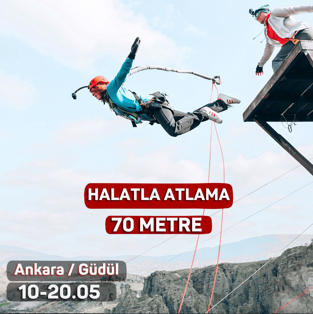 Rope Jump Ekibi ile Ankara Güdül’de 70 metreden aşağı Halatla Atlama 10-20 Mayıs tarihleri arasında gerçekleştirilecek. Kayalığın yakınında ise keşfedilebilecek antik mağaralar ve tüneller bulunmakta. Bu keşifleri atlama öncesi veya sonrasında yapabilirsiniz.