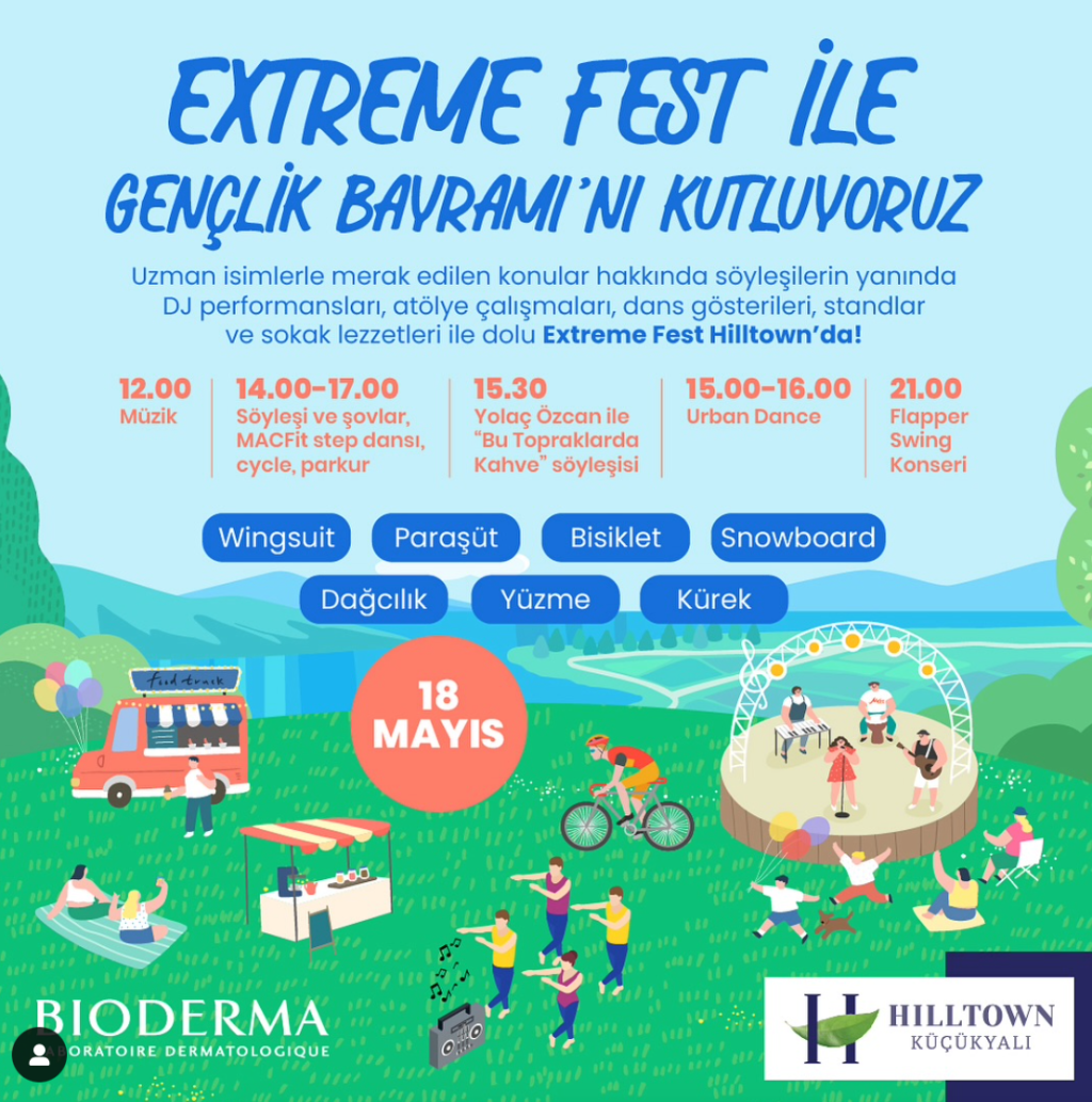 Küçükyalı’da bulunan HilltownAVM, 19 Mayıs Gençlik ve Spor Bayramı kapsamında 18 Mayıs’ta Extreme Fest düzenlemekte. Ücretsiz etkinlik boyunca uzman isimlerle merak edilen konular hakkında söyleşilerin yanında DJ performansları, deneyim alanları, dans gösterileri, ödüllü yarışmalar ve sokak lezzetleri ile Extreme Fest 18 Mayıs’ta Hilltown’da.