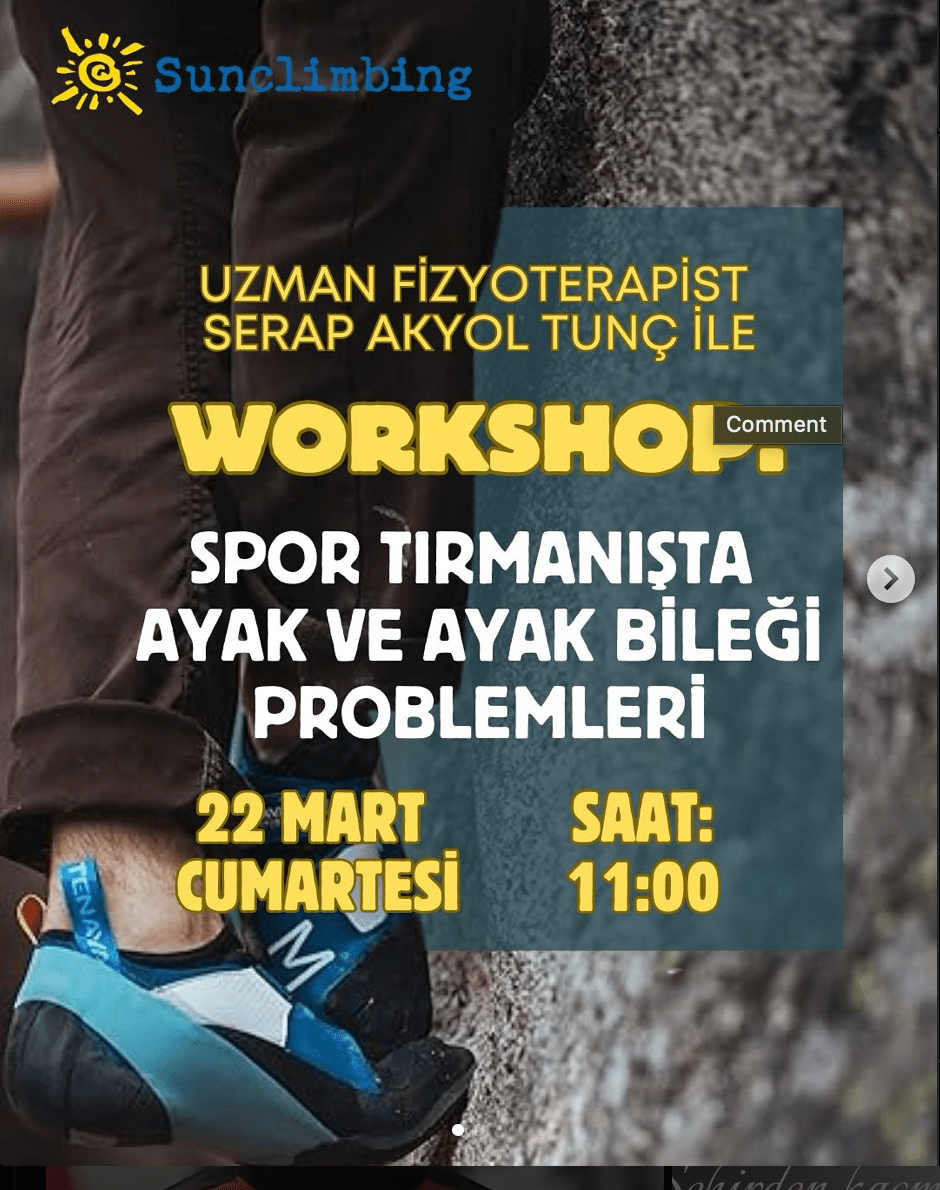 22 Mart sabah saat 11’de, Sun Climbing Geyikbayırı’nda spor tırmanışta ayak ve ayak bileği problemleri hakkında konuşulup, katılımcıların ayak plantar basınç analizleri yapılacaktır. Katılmak isteyenler https://www.instagram.com/sunclimbing_geyikbayiri/ adresine DM yoluyla ulaşabilirler.