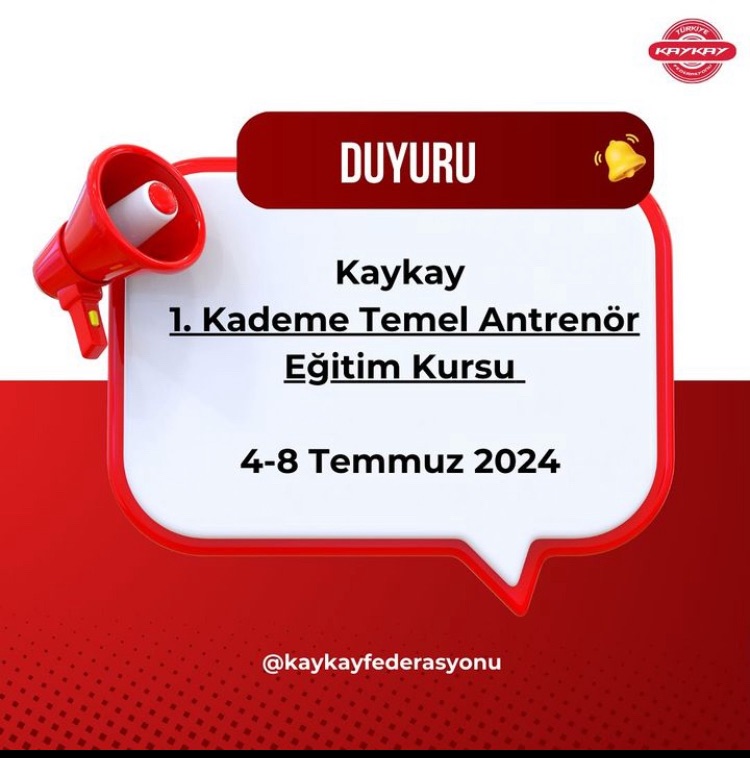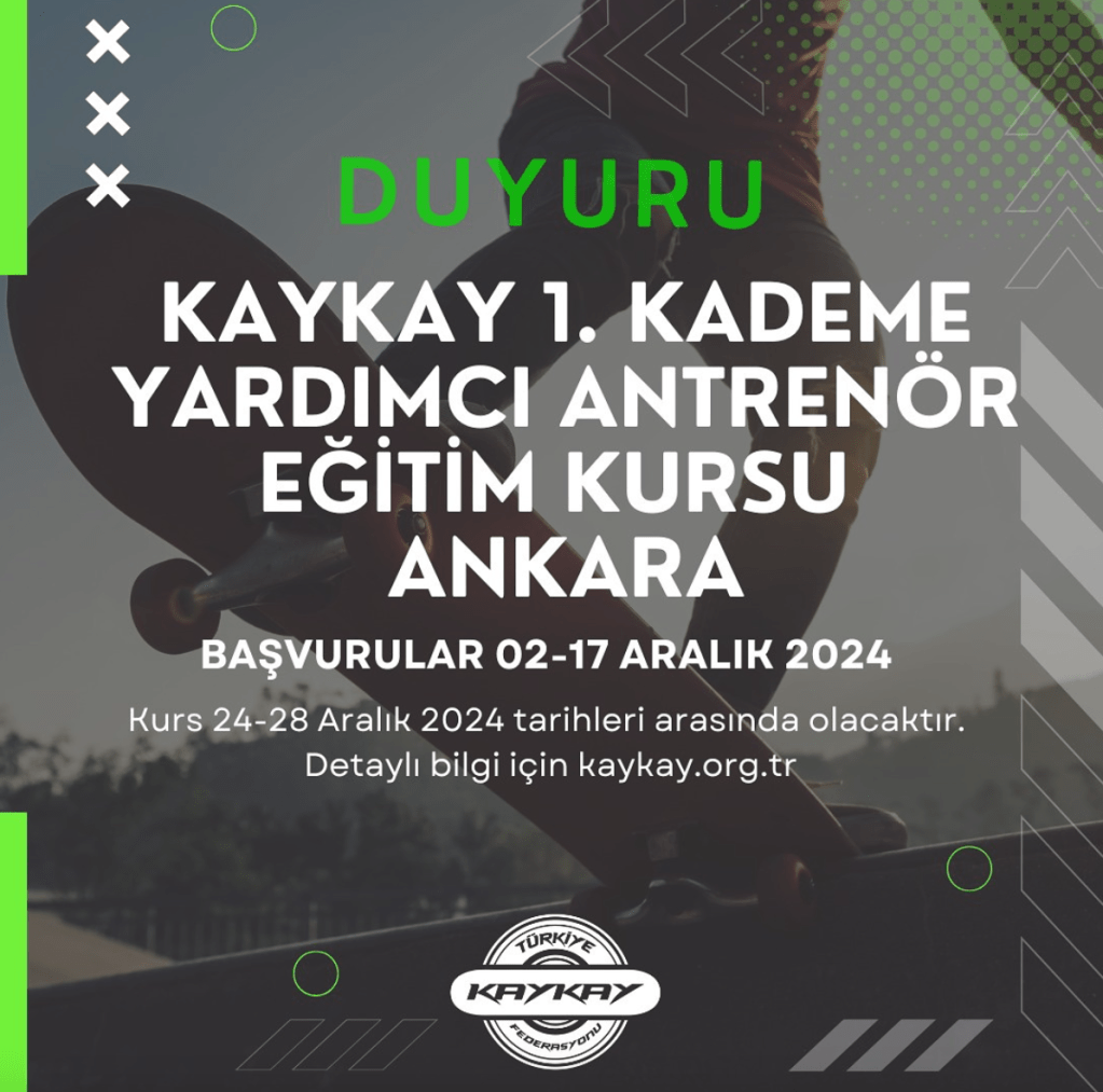 Kaykay 1. Kademe Yardımcı Antrenör Eğitim Kursu 24-28 Aralık 2024 tarihlerinde Ankara’da yapılacaktır.Başvuru kontenjanı 100 kişi ile sınırlıdır. Başvurular 02-17 ARALIK 2024 tarihleri arasında yapılmaktadır.Detaylı bilgi için kaykay.org.tr adresinde duyurular kısmına göz atınız.
