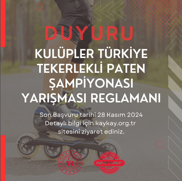 Türkiye Kaykay Federasyonu Başkanlığının 2024 yılı faaliyet programında yer alan Kulüpler Türkiye Tekerlekli Paten Şampiyonası yarışması 29 Kasım – 1 Aralık tarihleri arasında Karaman’da düzenlenecektir. Detaylı bilgi ve katılım için; https://kaykay.org.tr/turkiye-kaykay-federasyonu-baskanligi-kulupler-turkiye-tekerlekli-paten-sampiyonasi-yarismasi-reglamani/