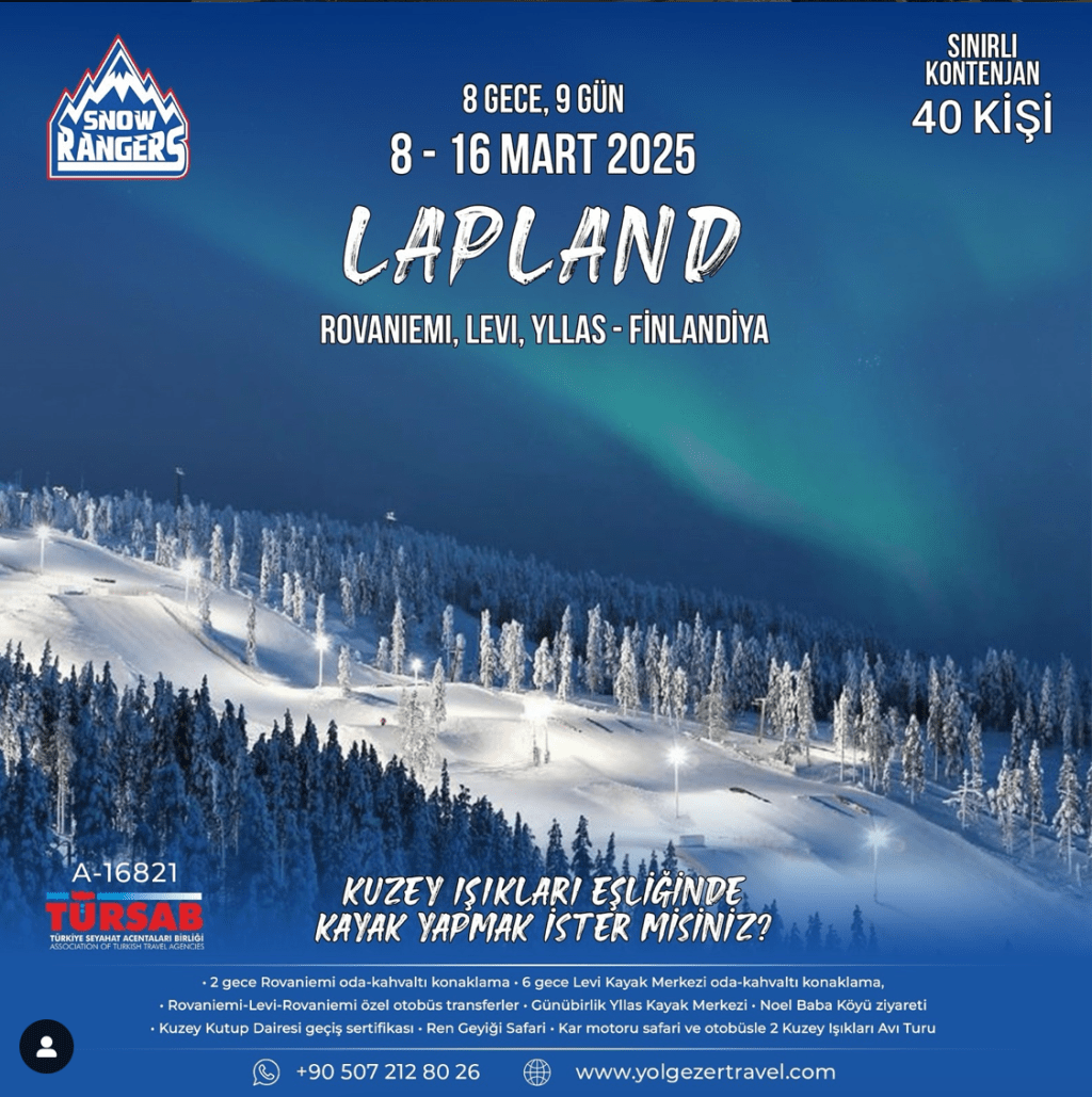 Yol Gezer Travel ile Snow Rangers Kayak Kulübü, 8-16 Mart 2025 tarihleri arasında Finlandiya Lapland’de kuzey ışıkları eşliğinde 8 gece 9 günlük kayak tatili düzenlemekte. 40 kişilik kontenjanı bulunan tatile 2 gece Rovaniemi oda-kahvaltı konaklama , 6 gece Levi Kayak Merkezi’nde oda-kahvaltı konaklama, Rovaniemi > Levi > Rovaniemi özel otobüs transfer , günübirlik Yllas Kayak…